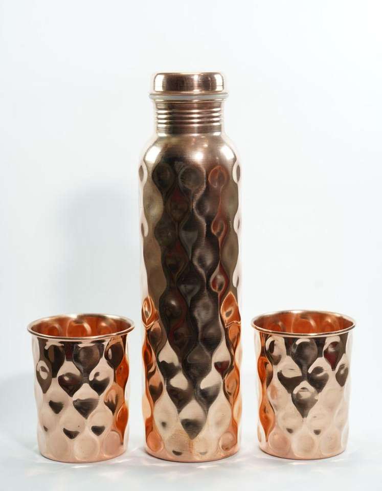 Súper oferta de septiembre, de cobre puro Vintage botella de agua de alta calidad, embalaje Premium, diferentes vasos de plástico hechos en India