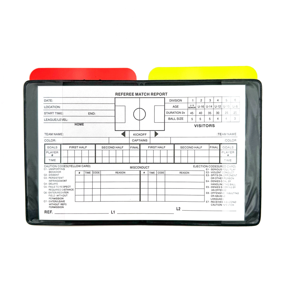 Un conjunto de una cartera de vinilo, una tarjeta roja y una amarilla, y 20 hojas de puntuaciónIncluido