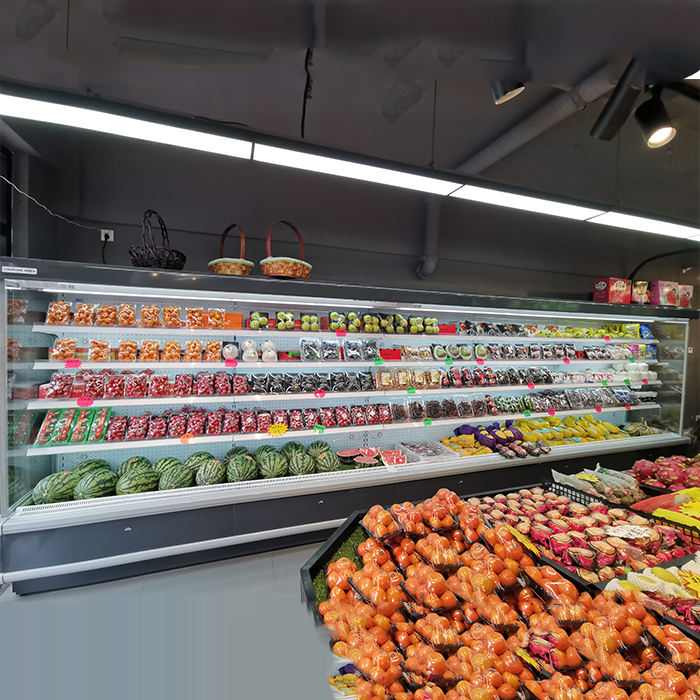 Refrigerador Multipuertas Abierto para Supermercado, Exhibición de Bebidas y Frutas, Congelador sin Puerta de Vidrio