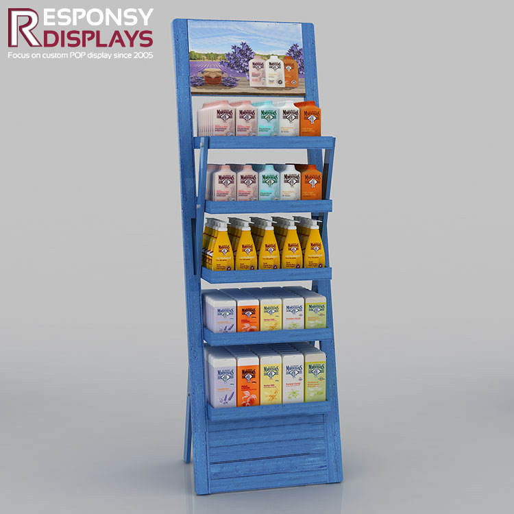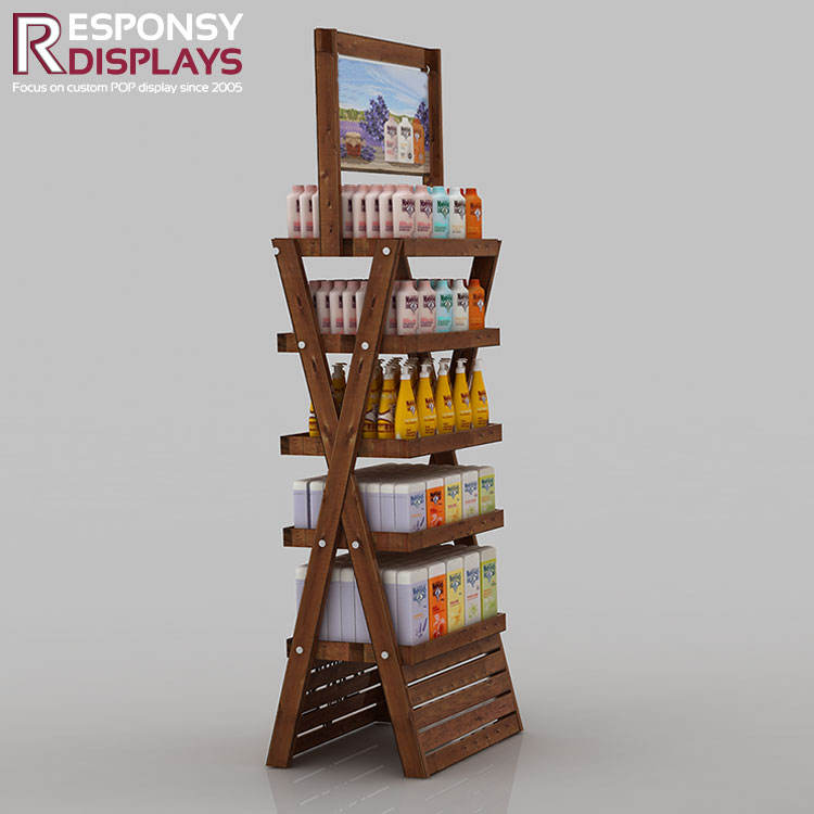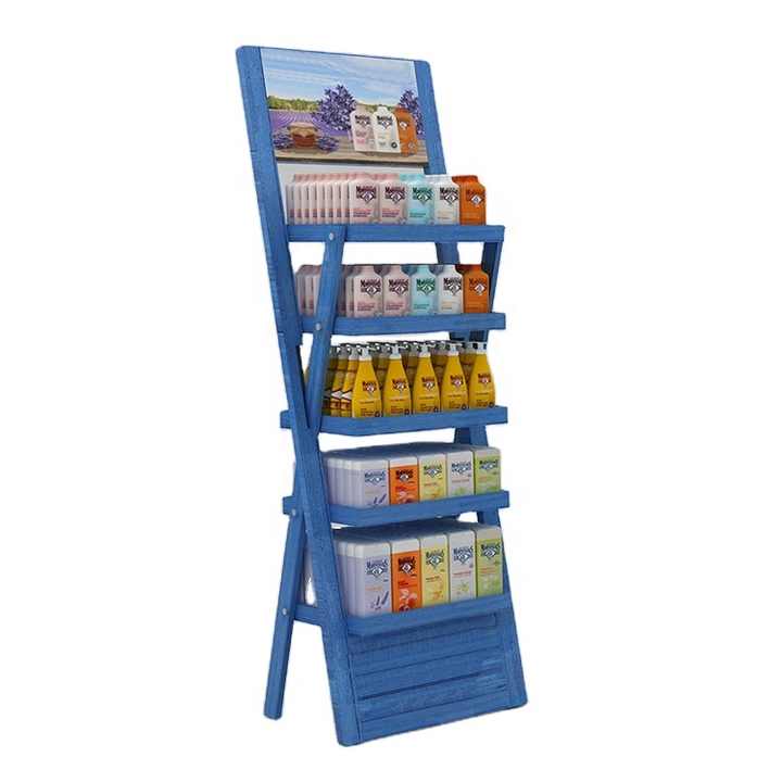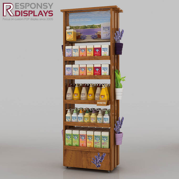 Estante de exhibición de pie de suelo de madera estante de venta al por menor de cinco capas para champú artículos para el hogar accesorio de tienda con Panel de pancarta