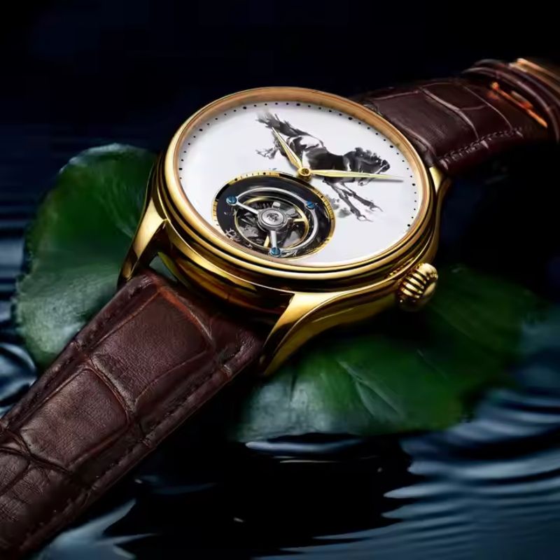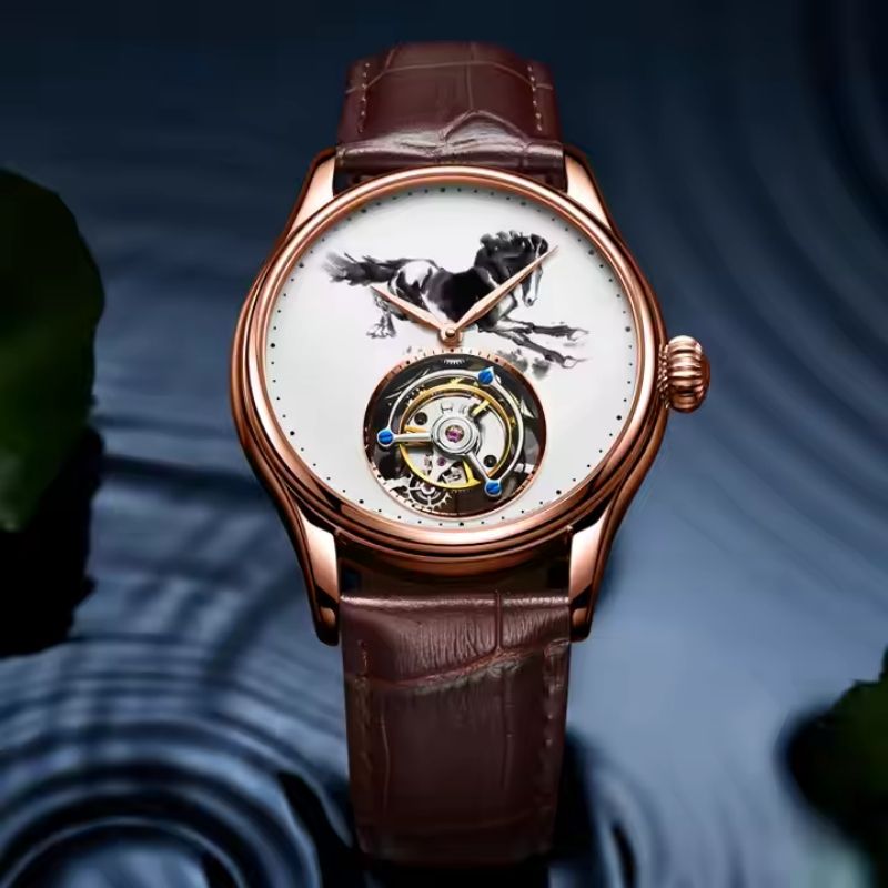 Soporte de reloj mecánico Tourbillon con logotipo personalizado para hombre, relojes Tourbillon de caballo con pintura de tinta, OEM