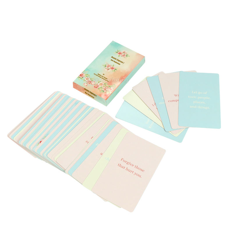 Admite Personalización completa, Impresión de tarjetas de alabanza curativas, juego de tarjetas de afirmación positiva, caras y espalda con Tuck Box