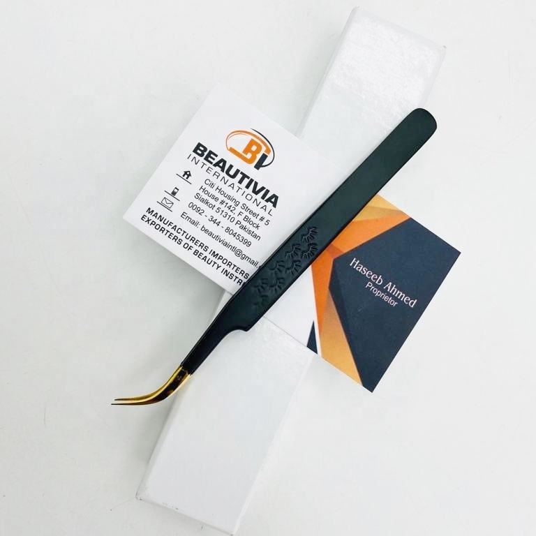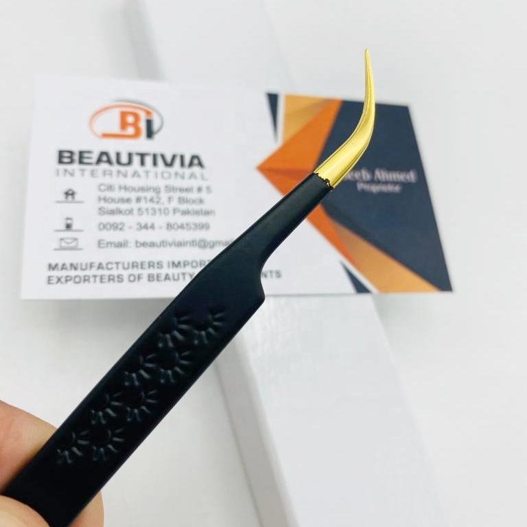 Pinzas de pestañas curvas de acero sostenible Pinzas de extensión de pestañas de fibra de volumen de oro negro con recubrimiento de polvo con impresión de pestañas