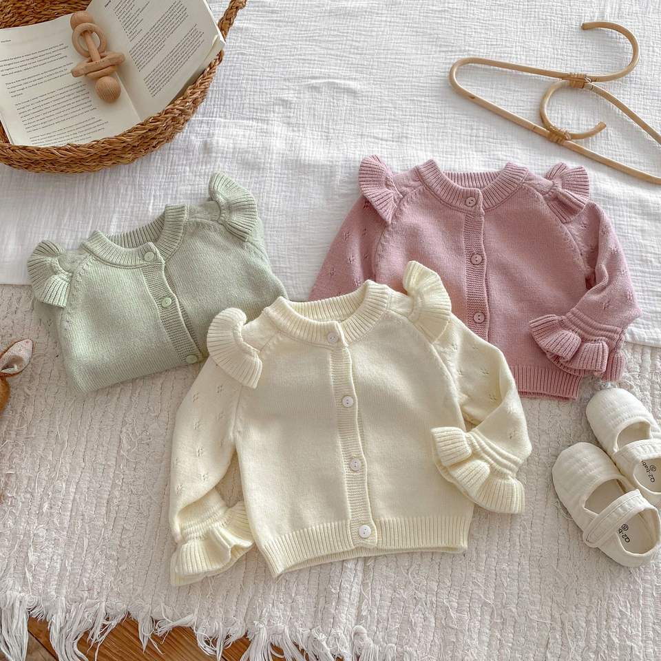 Sweet Baby Girls Primavera Otoño Ruffle Knit Set Botones Cardigans Pantalones acampanados Infant Bebe Knitted Two Pieces