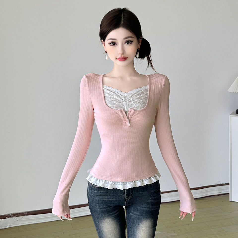 Camiseta de Manga Larga con Encaje Dulce y Diseño de Dos Piezas para Mujer, Corte Ajustado, Botones en la Parte Delantera, Dobladillo con Volantes, Top Bonito
