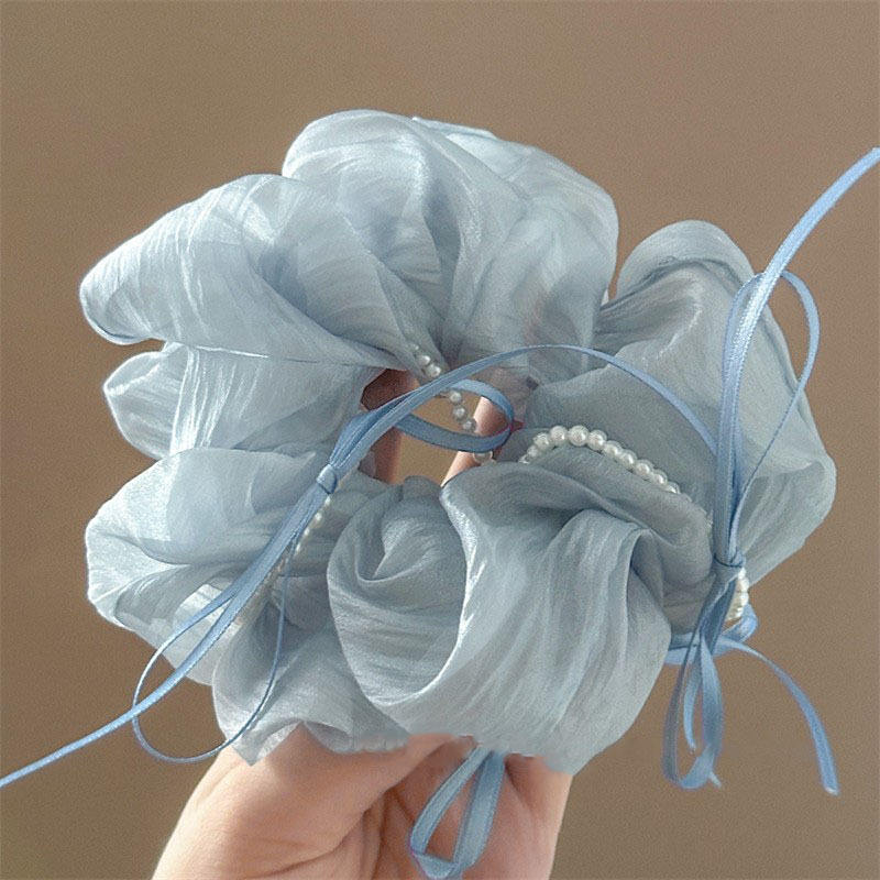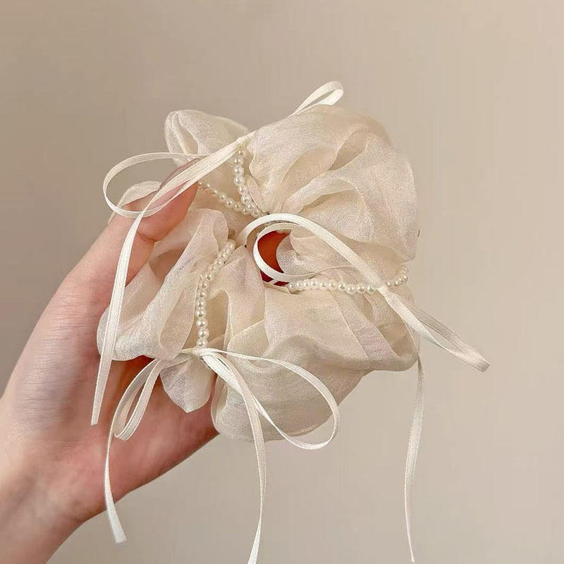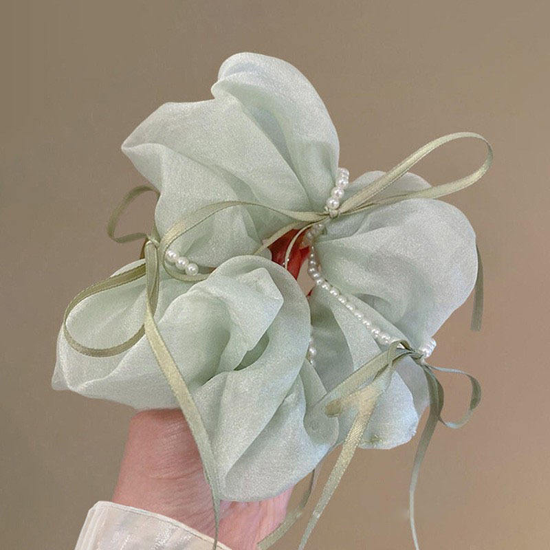 Coleteros de malla de color liso con lazo de perlas dulces de 12 cm para mujer, accesorios para el cabello
