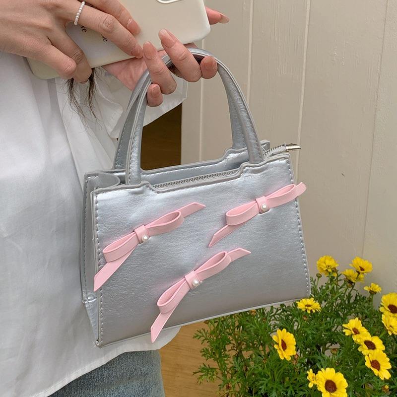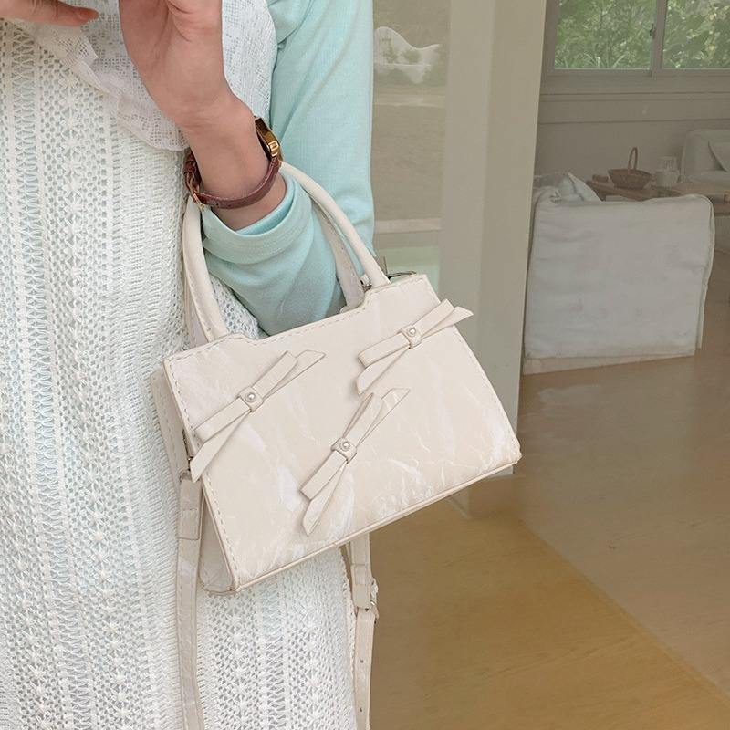 Bolso Cuadrado con Textura Dulce y Lazo Blanco, Bolso de Mano de Moda para Mujer, Uso Diario, Primavera 2024