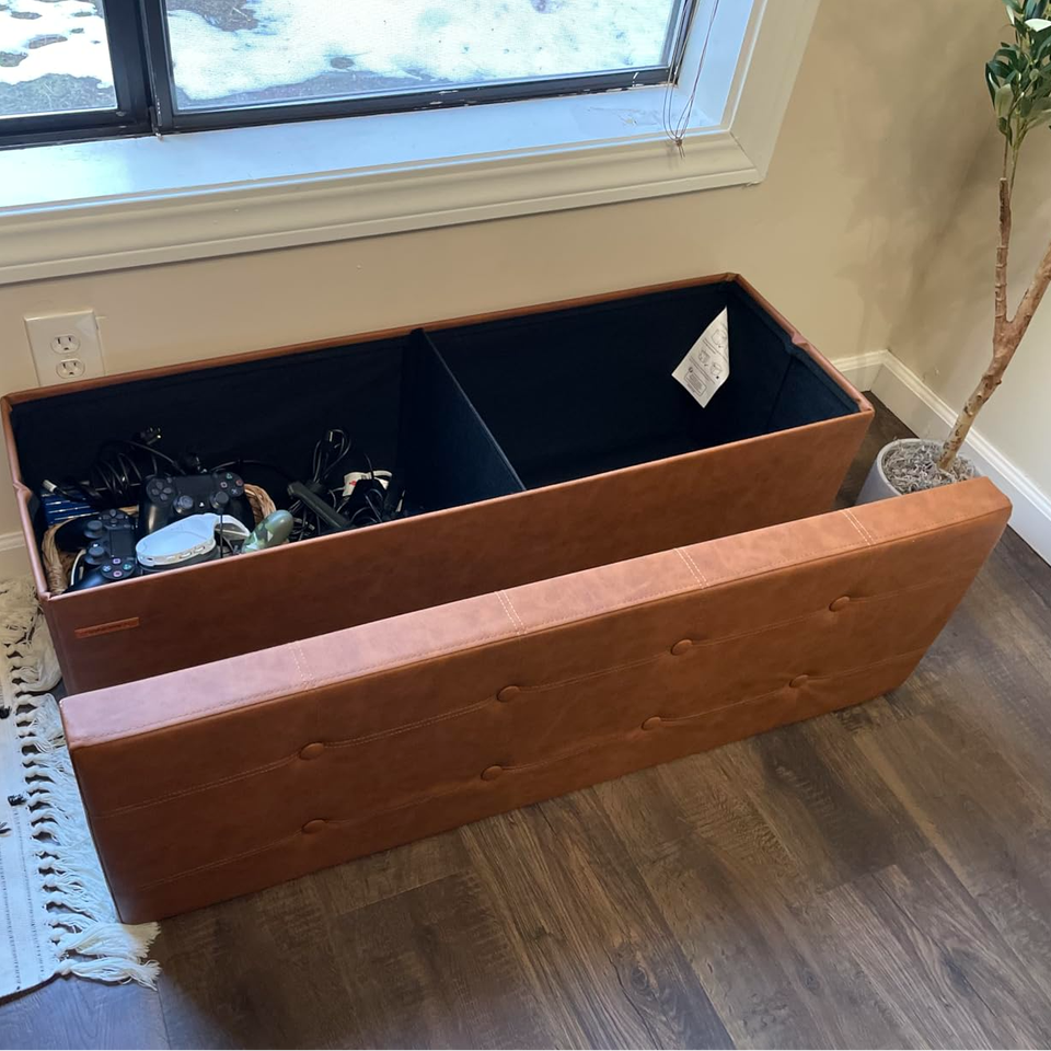 Taburete de reposapiés de cuero sintético, Banco otomano de almacenamiento plegable para sala de estar o dormitorio