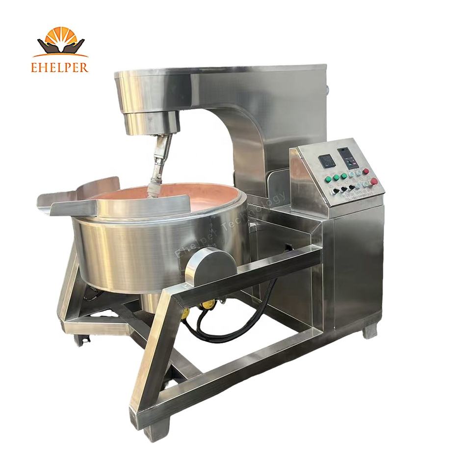 Automatic planetary mixing, scraping bottom and sides without sticking., T2 pure copper inner bowl, non-stick for sugar cooking, improves taste with copper ion reaction., Mixing speed adjustable from 0-29 rpm., Mixing arm can be fully lifted automatically for easy feeding and cleaning., Automatic tilting for fast and clean discharging., Optional electric heating with thermal oil jacket or gas direct heating., Uniform heating and stable temperature control for sugar products., Thickened copper pot, durable, food-grade standard.