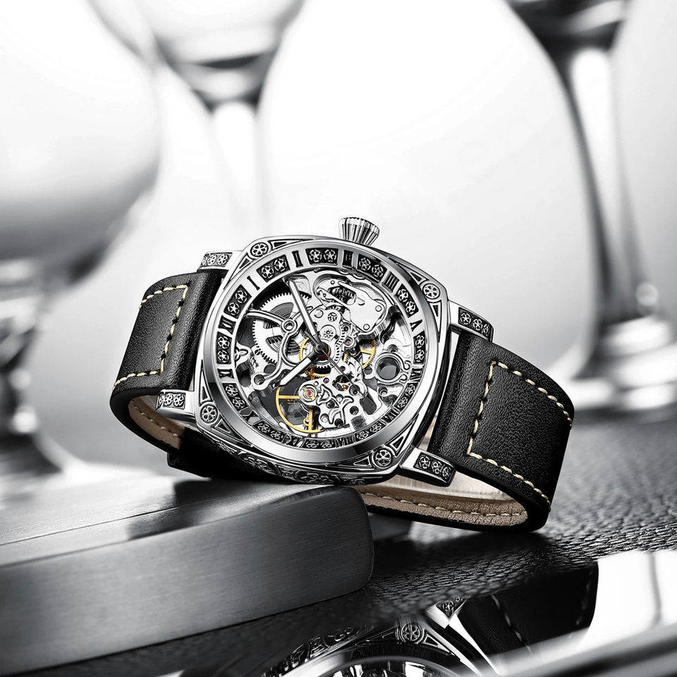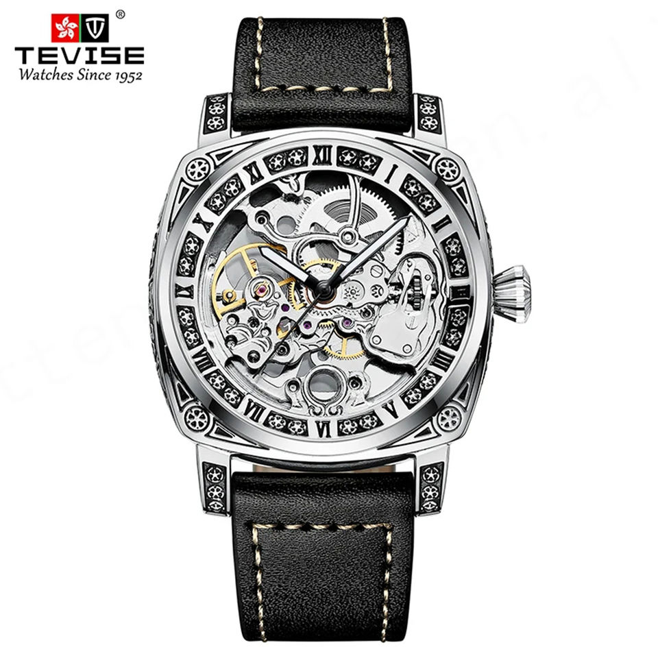 Relojes automáticos con esqueleto T894 TEVISE, superventas, relojes cuadrados para hombre, relojes de pulsera mecánicos con correa de cuero ahuecados, reloj