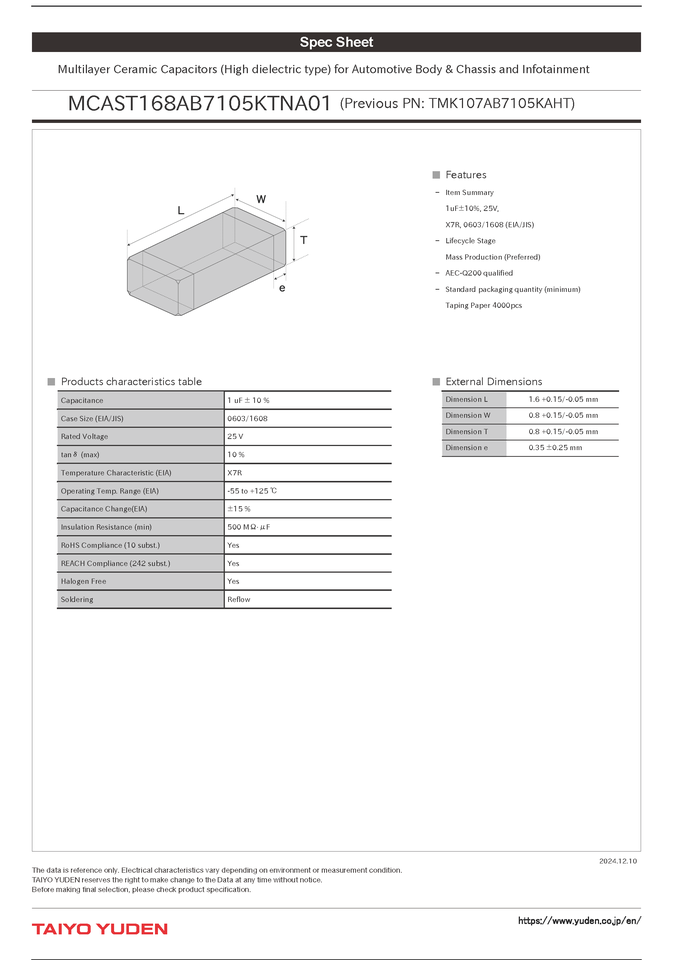 Condensador Cerámico Multicapa para Telecomunicaciones TAIYO YUDEN, 1uF 25V 10% X7R SMD AEC-Q200 MCAST168AB7105KTNA01 TMK107AB7105KAHT