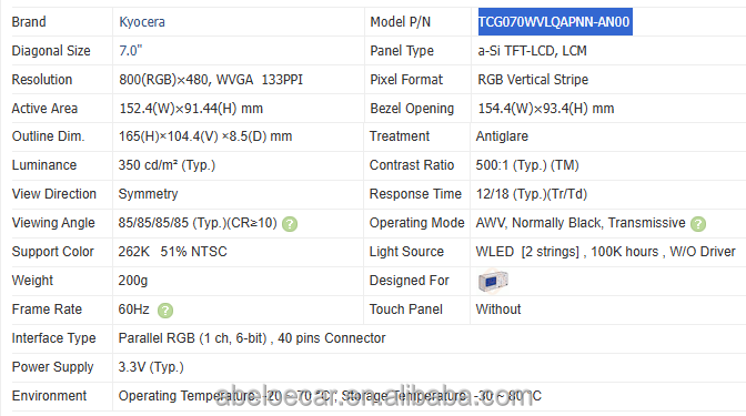Tipo de señal:RGB paralelo (1 canal, 6 bits), conector de 40 pines