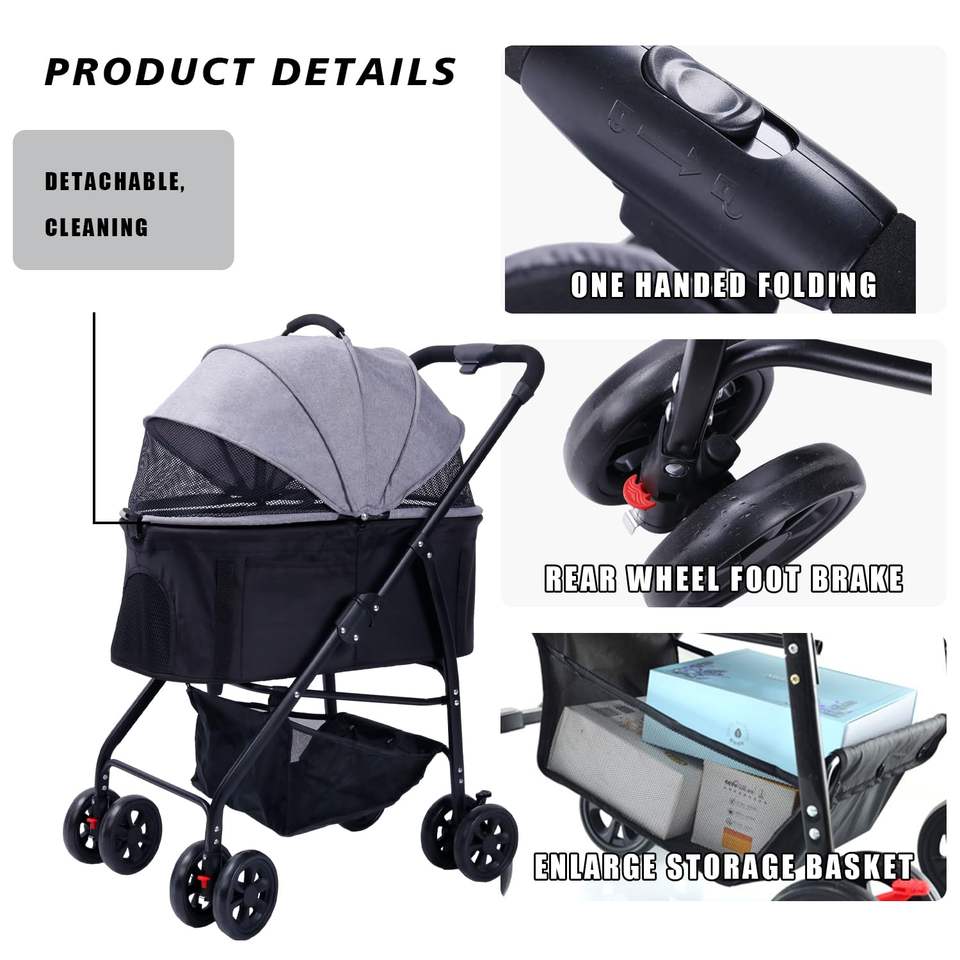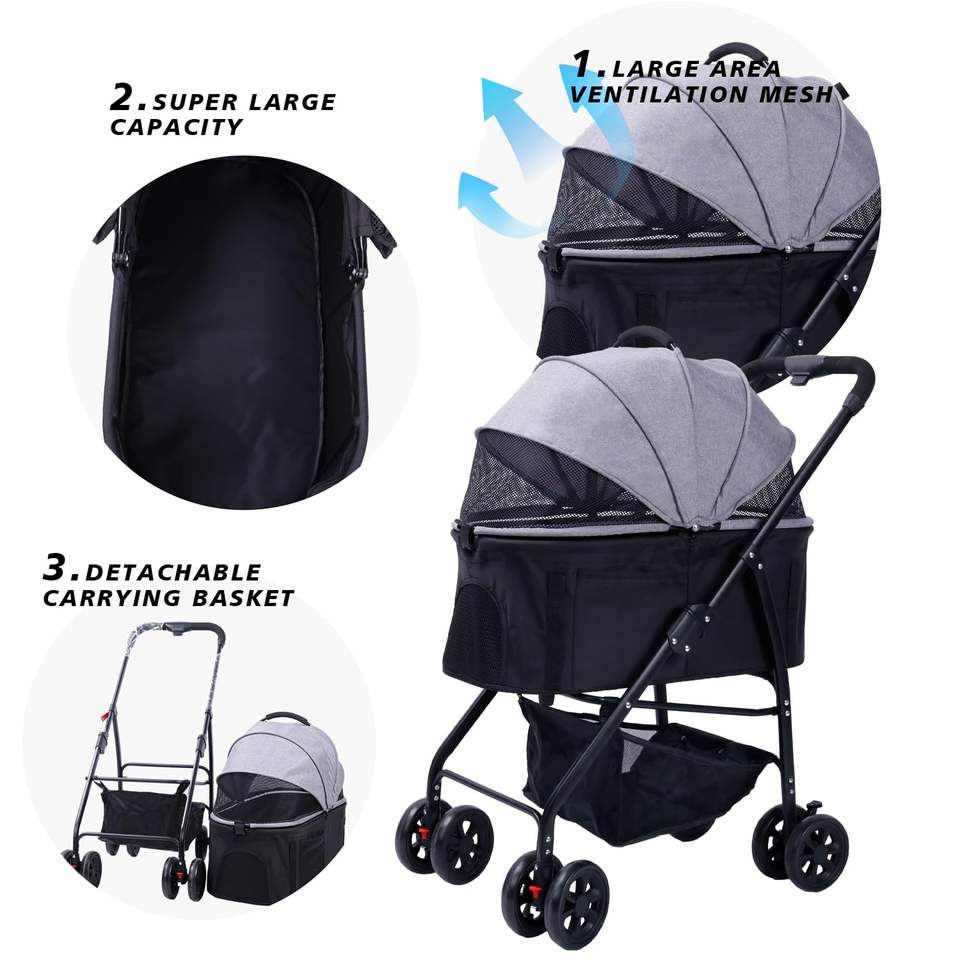 Cochecito para mascotas de cuatro ruedas con marco plegable de acero inoxidable, paneles transpirables y cesta grande debajo del asiento, 2 unidades