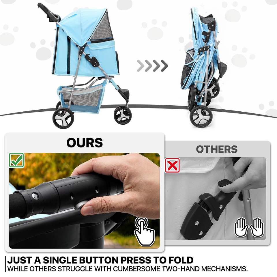 Cochecito para mascotas al aire libre de tres ruedas con marco liviano y correa de seguridad para mascotas
