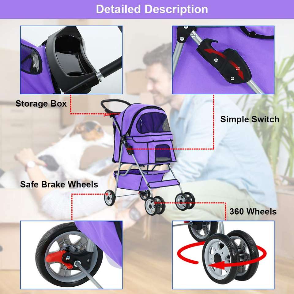 Cochecito plegable para mascotas de cuatro ruedas con diseño espacioso, cubierta para la lluvia, malla transpirable y espacio de almacenamiento, 1 unidad