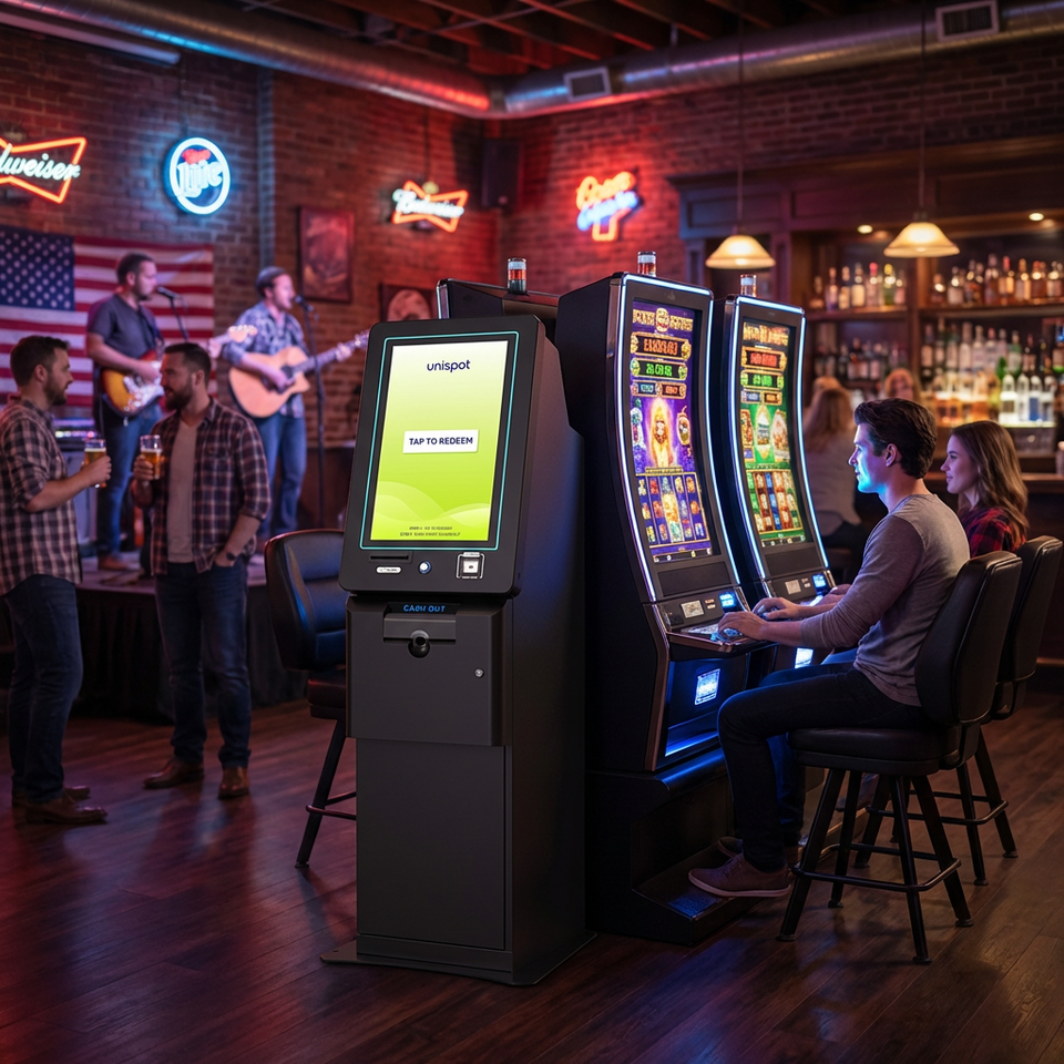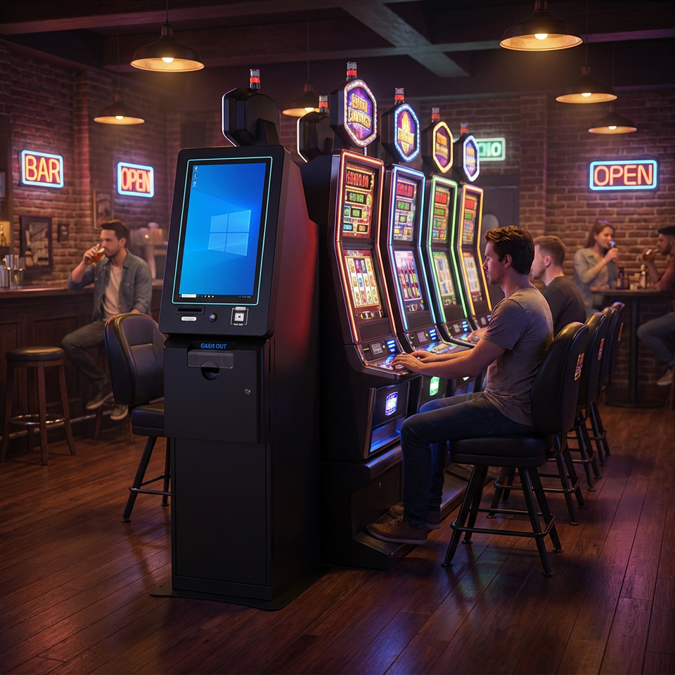 Sistema TICO ATM Kiosk con Dispensador de Efectivo Puloon LCDM4000 y Barra para Gabinete de Juegos de Habilidad Serie Fusion Link Big Daddy