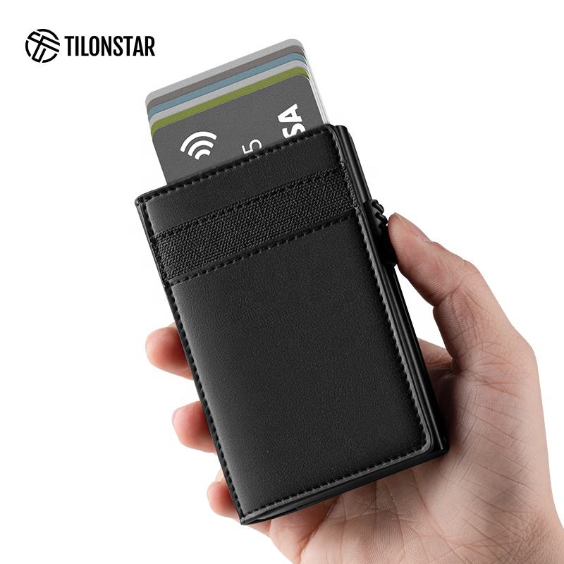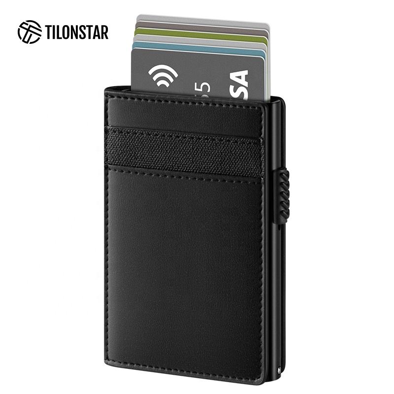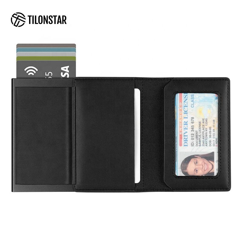 TILONSTAR TVC316 Regalo Rfid Bloqueo Crazy Horse Cuero Aluminio Pop Up Wallet Bi-Fold Tarjetero Monedero