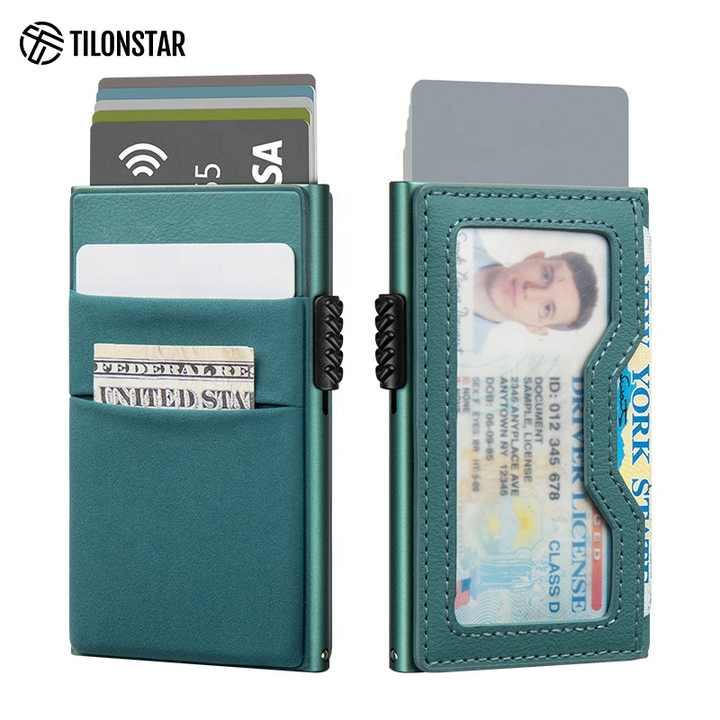 TILONSTAR TVC326 - Tarjetero Delgado de Aluminio con Logotipo Personalizado, Funda para Tarjetas de Identificación, Bloqueo RFID, Porta Tarjetas de Crédito Metálico con Sistema Pop-up