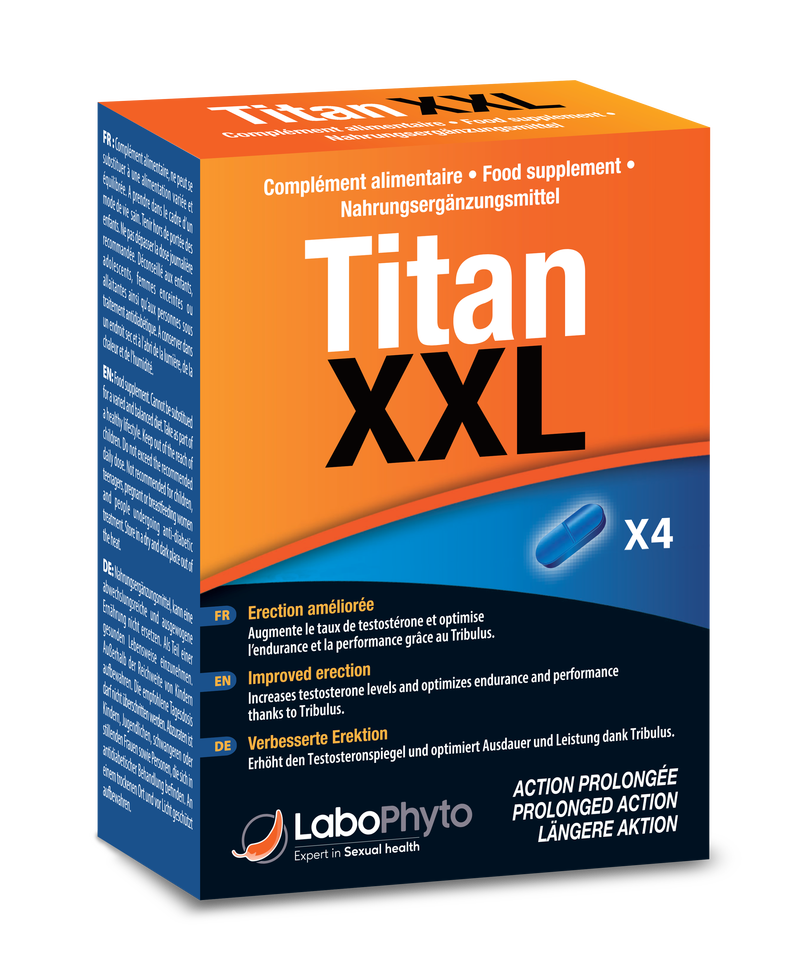 TITAN XXL 4 tabletas Complemento alimenticio con vitaminas para mejorar la erección, estimulante con Tribulus ginseng