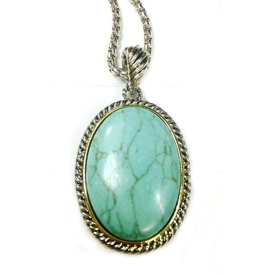 Collar de cadena de caja bicolor TJ Magic con colgante ovalado de turquesa chapado en rodio, con esmeralda, circonita y moissanita.