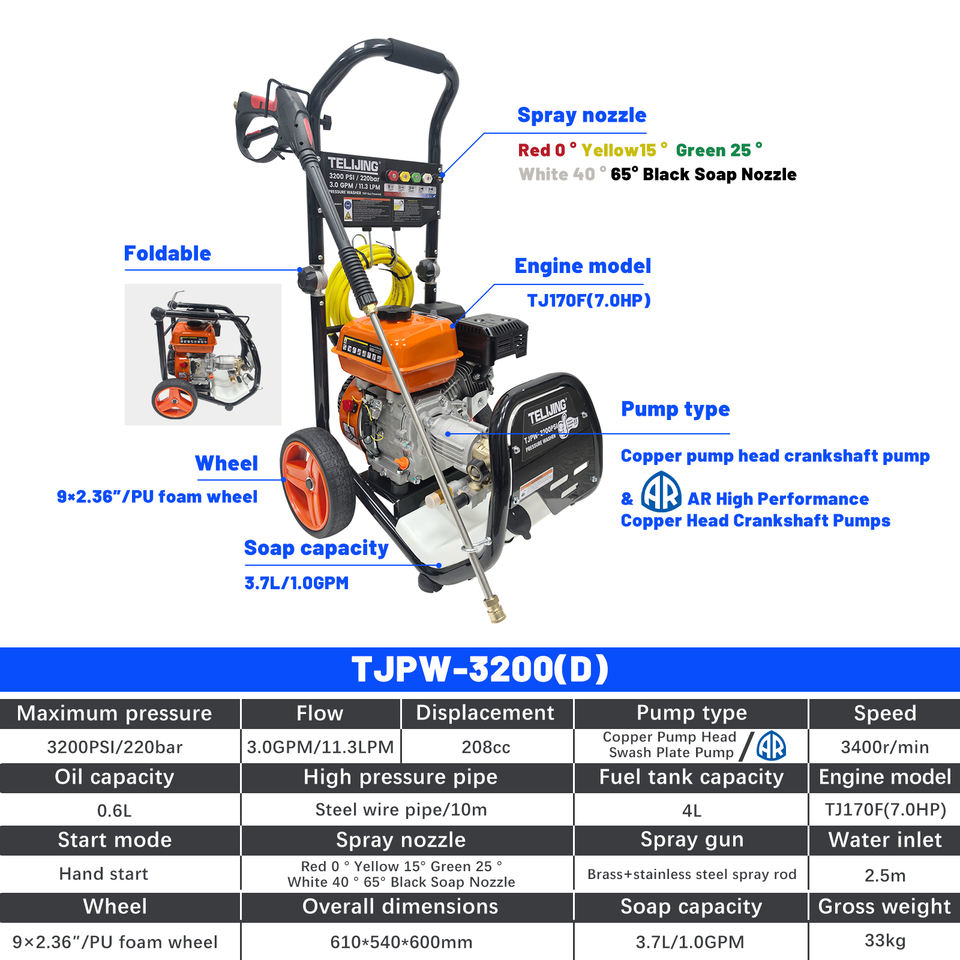 Hidrolavadora de Alto Impacto TLJ, Limpiadora a Presión Portátil con Bomba AR de 3200 PSI/220 Bares para Limpieza de Automóviles, Talleres y Vehículos