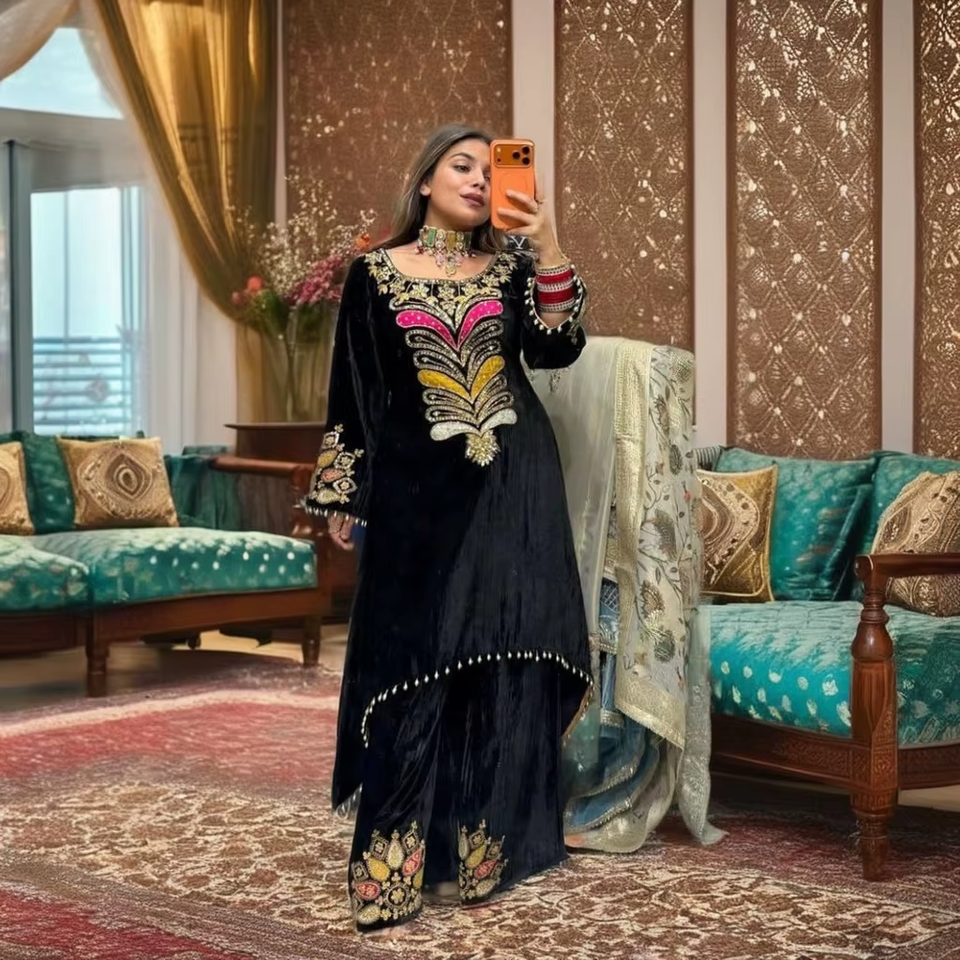 Traje de Fiesta Moderno TOP PLAZZO con Bordado de Lentejuelas y Parches de Terciopelo para Mujer, Largo hasta la Rodilla