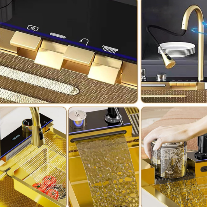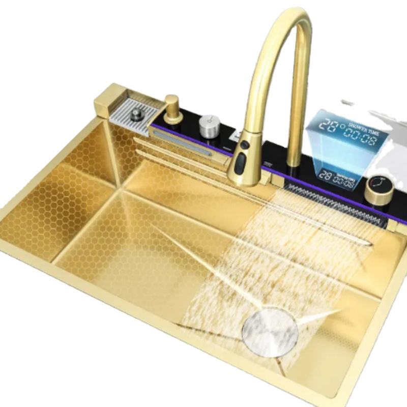 Fregadero de cocina inteligente dorado TOP1, lavabo de agua de lluvia de ballena de acero inoxidable grueso grande, diseño moderno para cocinas caseras