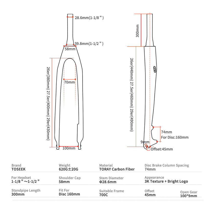 TOSEEK Mtb Bicicleta Horquilla rígida Freno de disco Alta resistencia Bicicleta de montaña Horquilla de montaje Horquilla delantera cónica