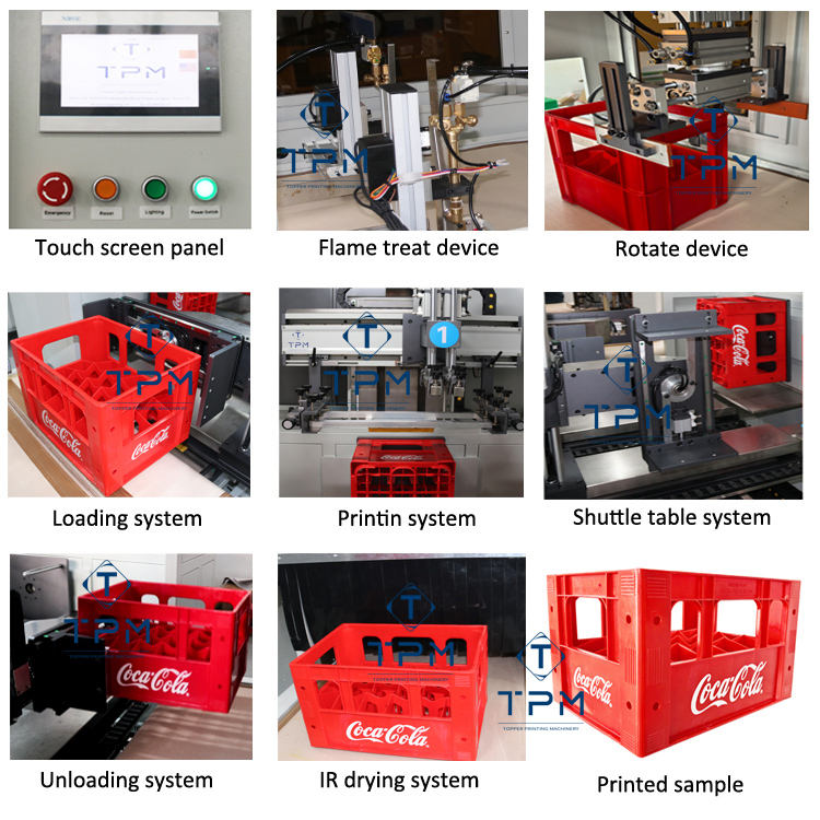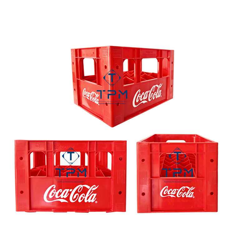 Máquina de serigrafía automática TPM de 2 colores para cajas de plástico de bebidas, cerveza y refrescos.
