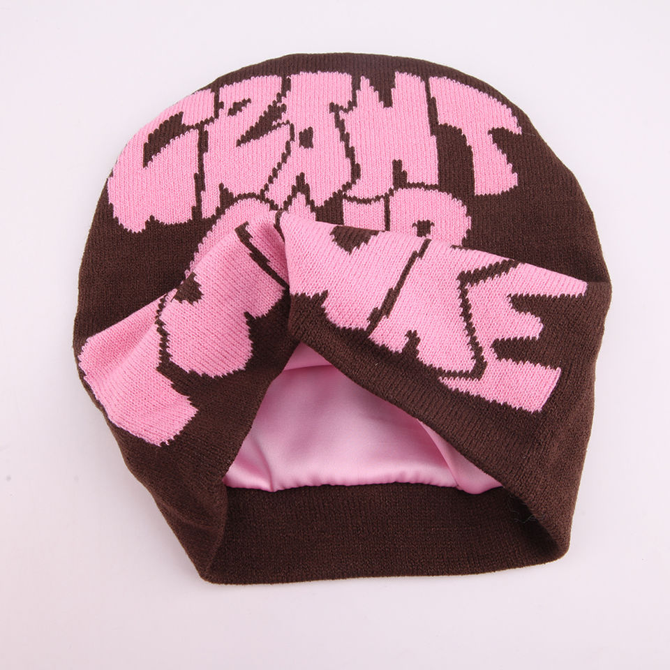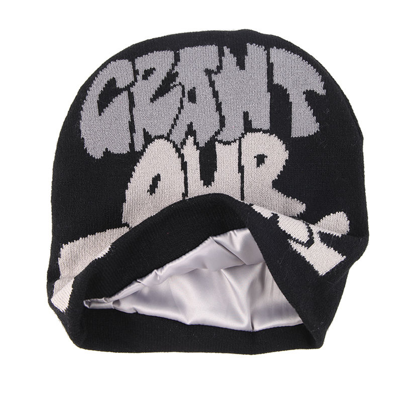 TRADE IN MFG Gorro personalizado de punto de invierno con logotipo bordado Jacquard Gorro Forrado de seda satinada con forro interior de satén
