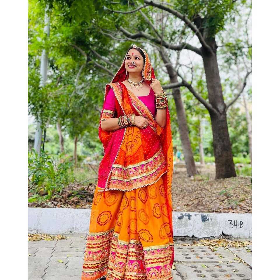 BANDHANI DE SEDA DE CHIFON TRADICIONAL LACE WORK SAREE CON BLUSA DESCOSADA NARANJA