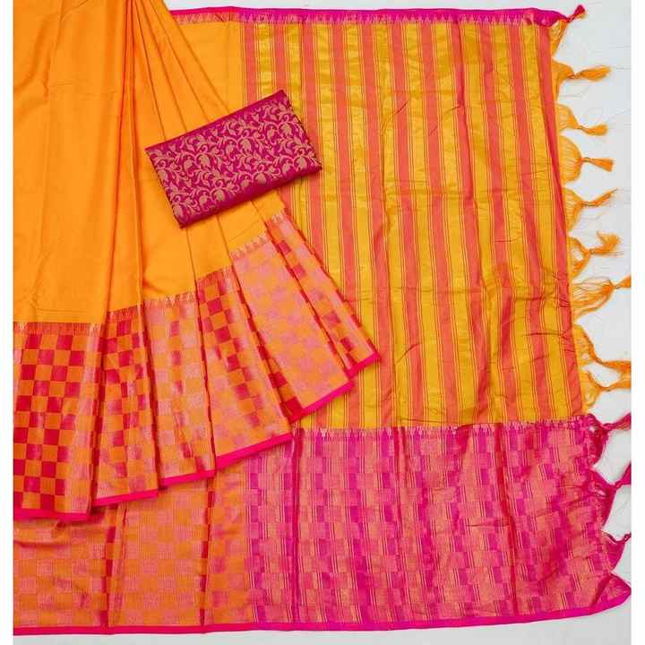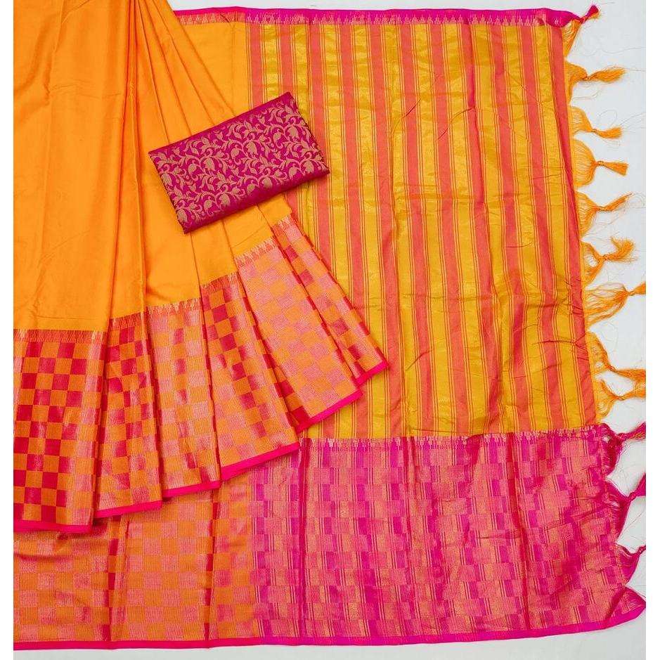 TRADICIONAL ALGODÓN SEDA JACQUARD BORDER WORK SAREE CON BLUSA SIN COSTAR MOSTAZA