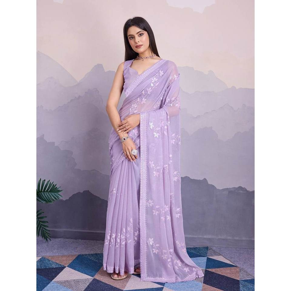 TREANDING CHIFFON BORDADO SECUENCIA TRABAJO SAREE CON BLUSA SIN COSTAR LAVANDA