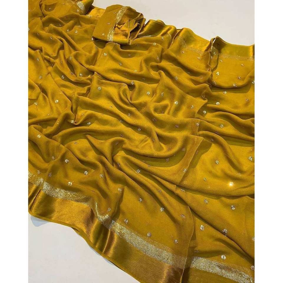 TREANDING VISCOSA GEORGETTE SATIN PATTA BORDER SEQUENCE BUTTI WORK SAREE CON BLUSA DESCOSADA MUSTURD