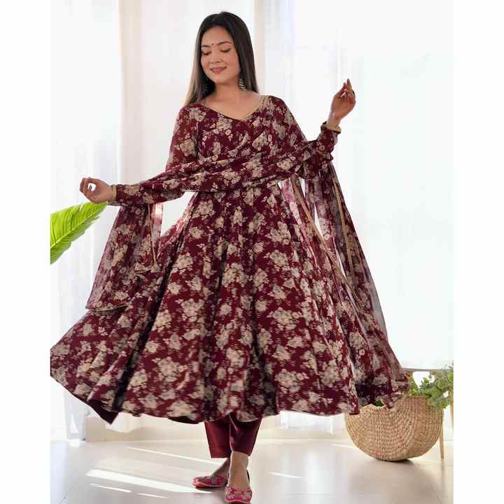 TRENDING FAUX GEORGETTE FLORAL ESTAMPADO FANCY LACE WORK BOTTON CON DUPATTA MAROON