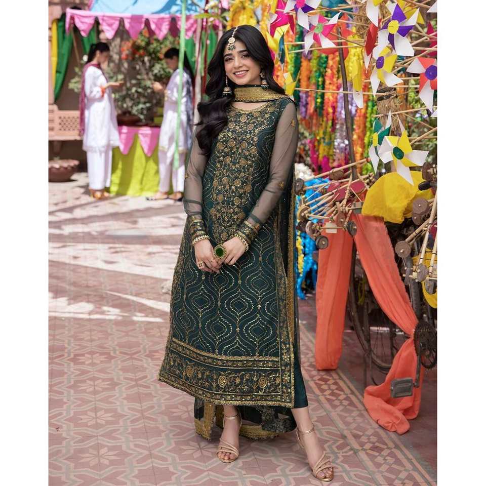 TENDENCIAS GEORGETTE BORDADO SECUENCIA TRABAJO TOP INFERIOR CON DUPATTA VERDE