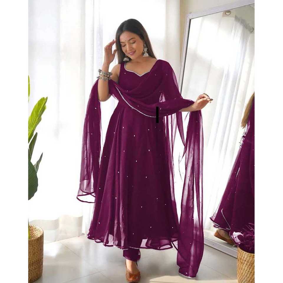 TRABAJO DE SECUENCIA DE BORDADO DE GEORGETTE DE TENDENCIA CON FONDO DE VESTIDO DE ENCAJE CON VINO DUPATTA