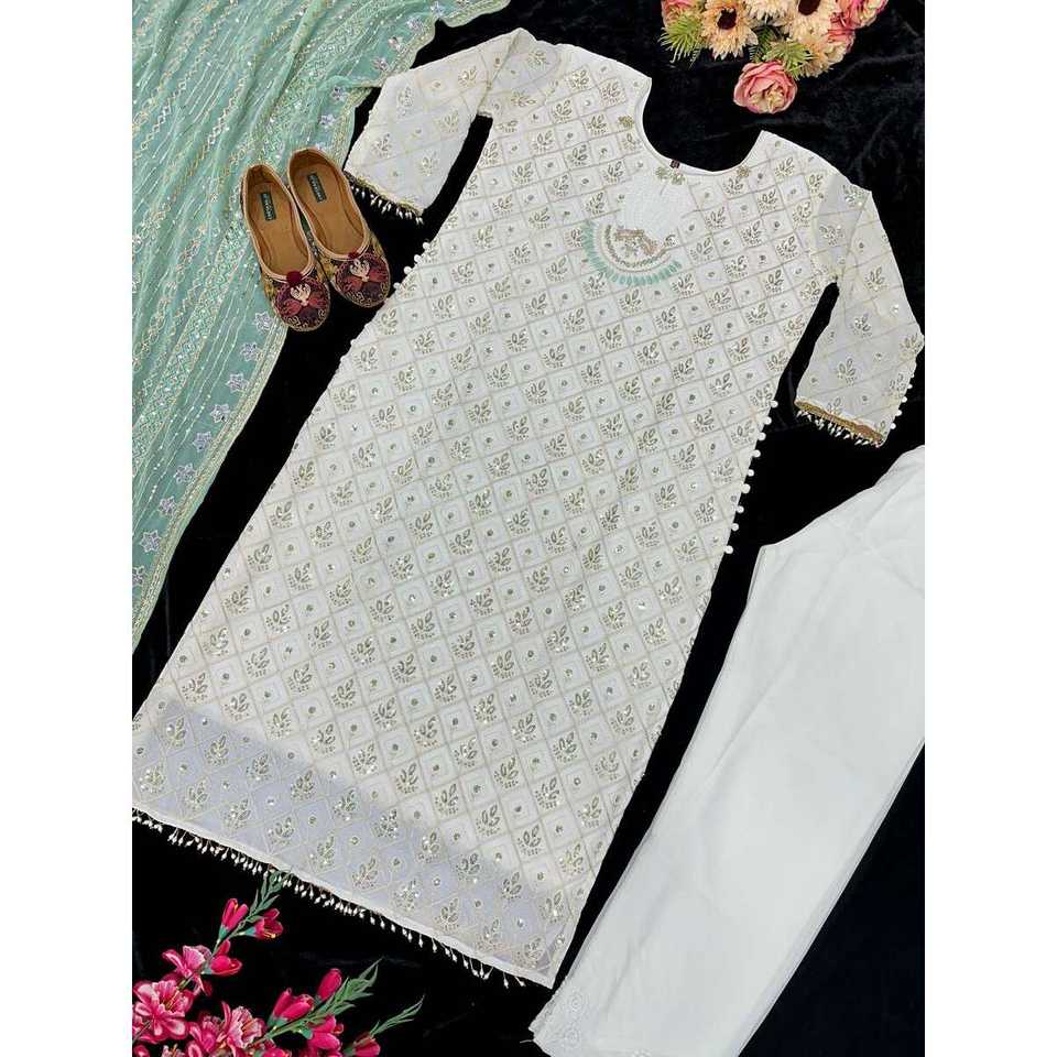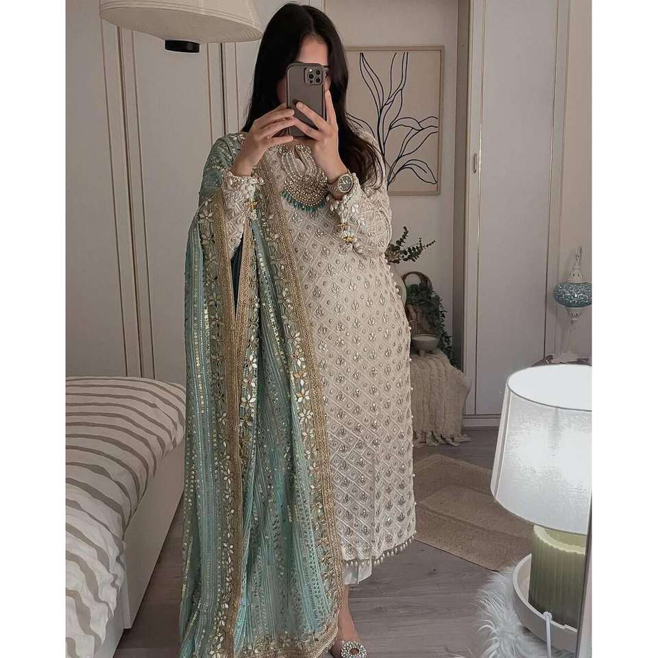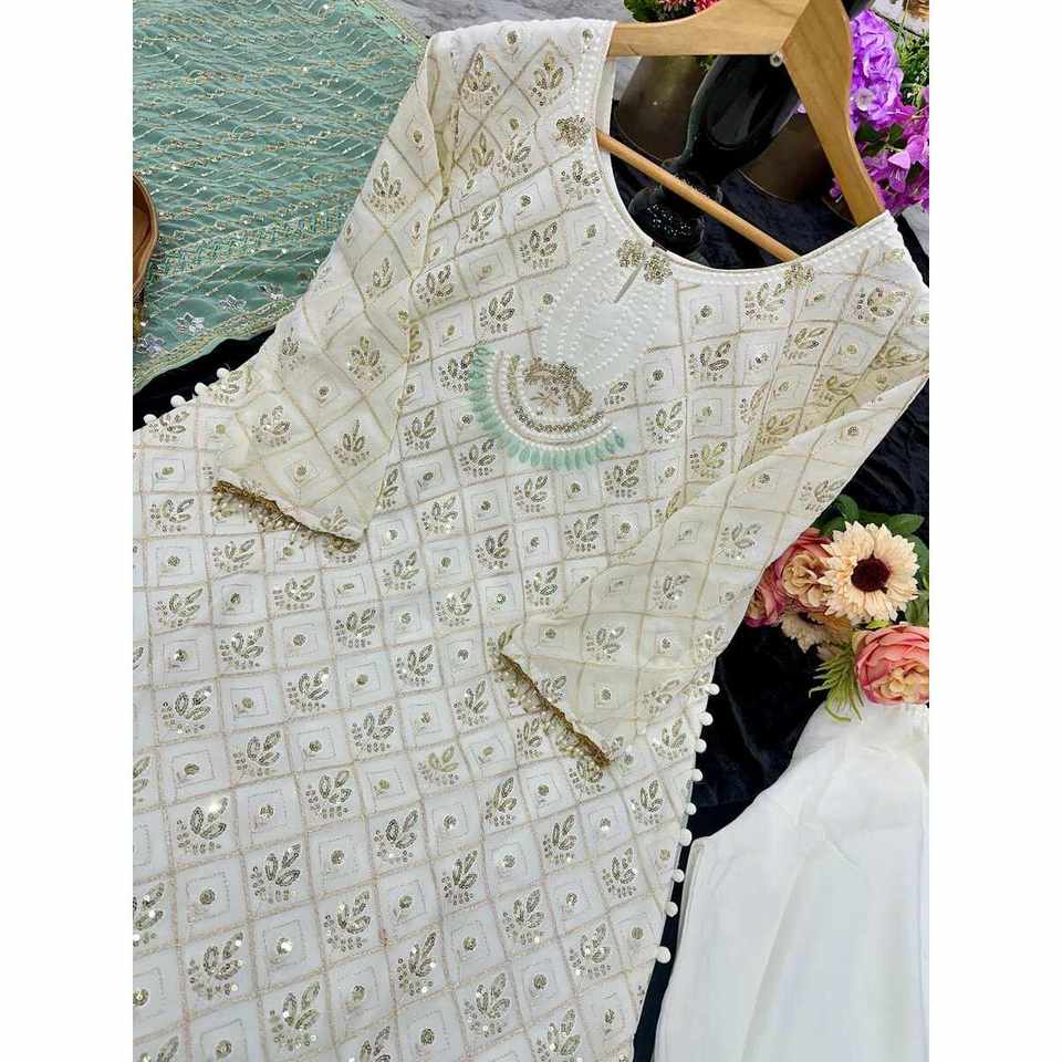 Conjunto de Top y Pantalón con Bordado de Lentejuelas en Georgette de Moda con Dupatta Verde Mar
