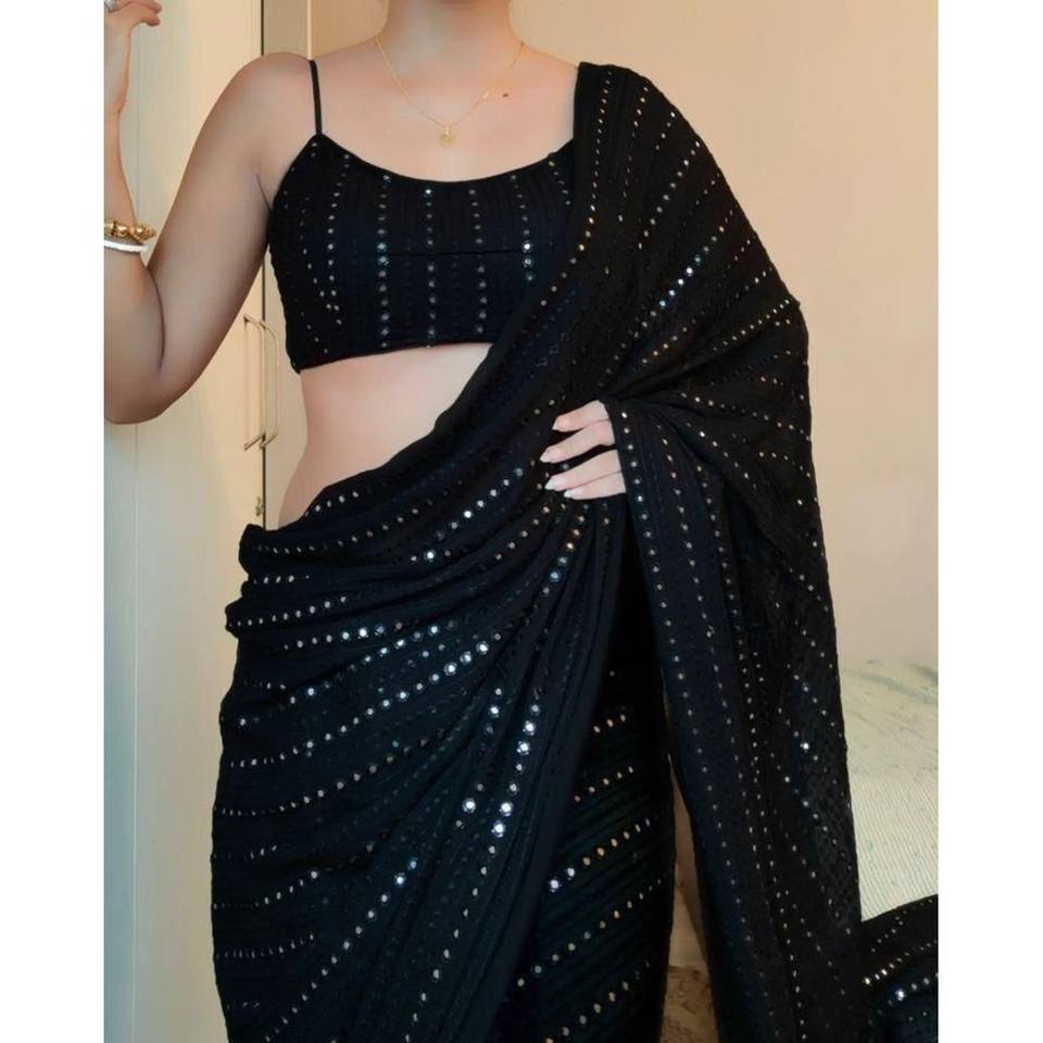 Sari de Georgette con Bordado de Lentejuelas y Blusa sin Coser en Negro, en Tendencia
