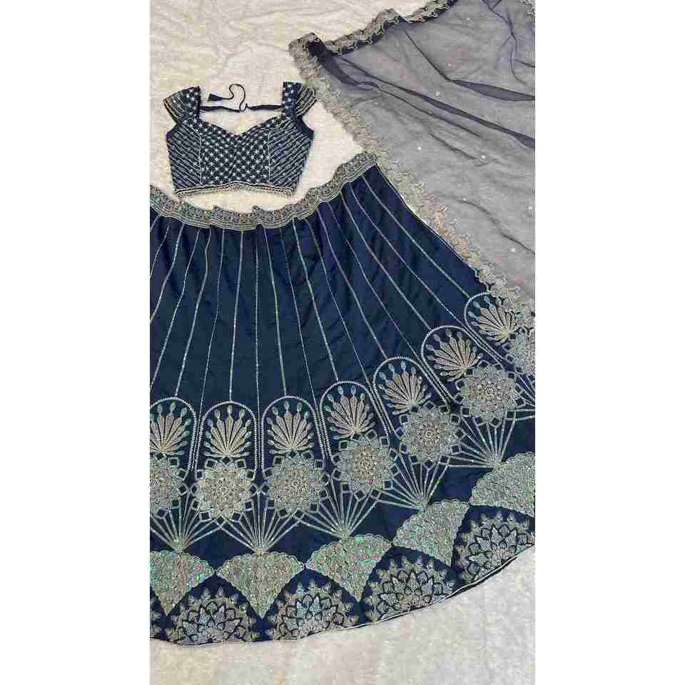 LEHENGA CHOLI DE SEDA RANGOON CON TRABAJO DE LENTEJUELAS DE MODA CON DUPATTRA AZUL MARINO
