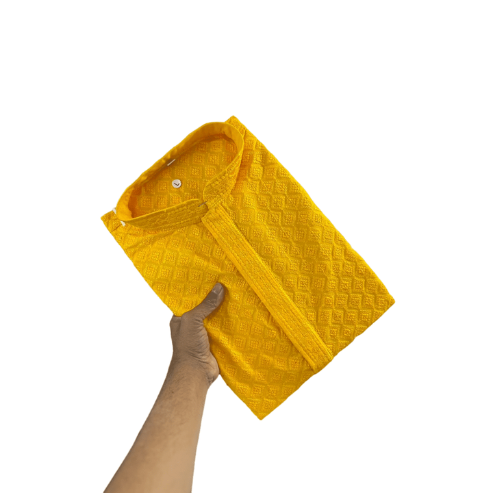 TENDENCIA RAYON ALGODÓN MÁQUINA BORDADO TRABAJO HOMBRE KURTA CON PAYJAMA AMARILLO