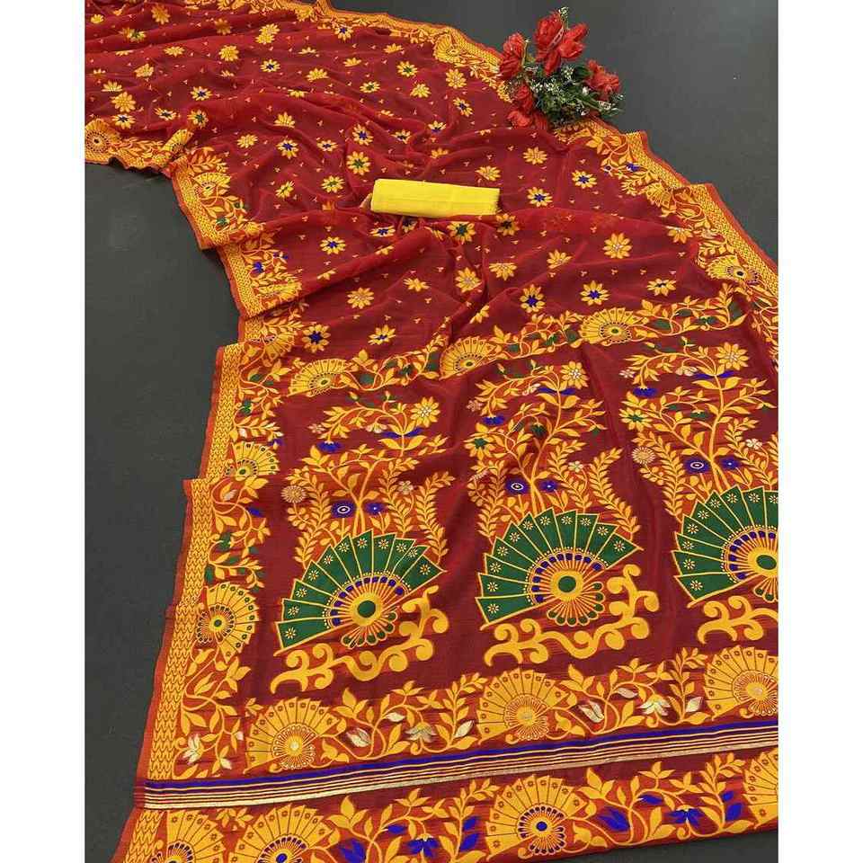 TRENDING SUAVE ALGODÓN TEJIDO TRABAJO SAREE CON BLUSA SIN COSTAR ROJO