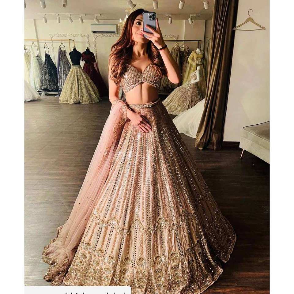 LEHENGA CHOLI DE MODA SIN COSTURAR CON BORDADO DE SEDA, LENTEJUELAS Y ESPEJOS DE PAPEL CON DUPATTA CHIKOO