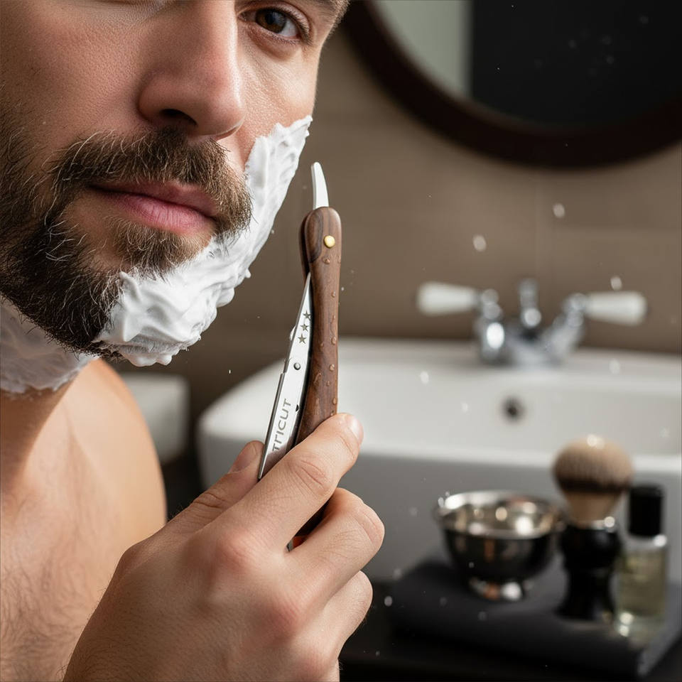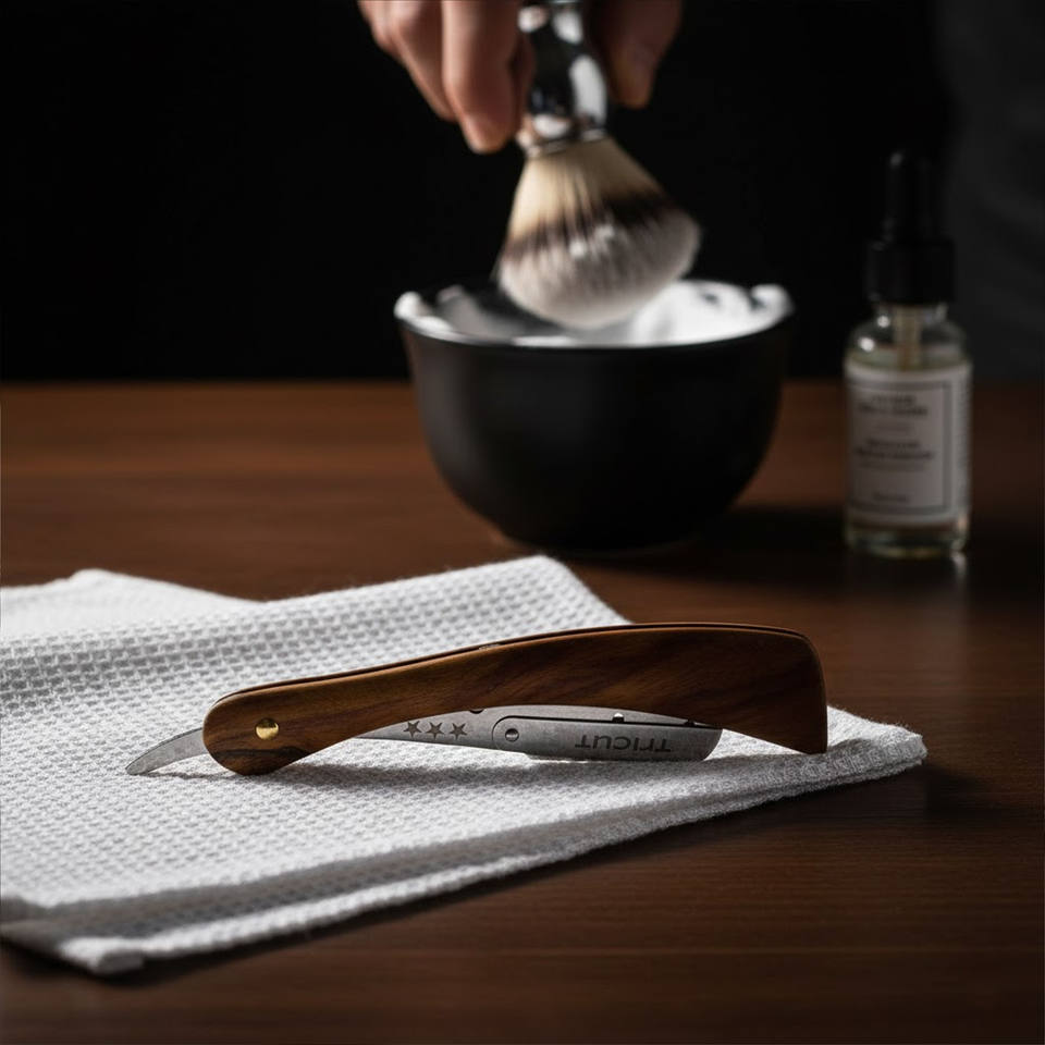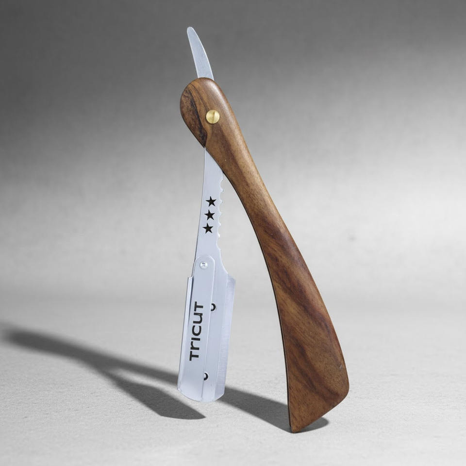Navaja de Afeitar Recta TRICUT Premium con Mango de Madera, Navaja de Barbero Profesional con Soporte de Acero Inoxidable, Instrumentos de Salón y Belleza