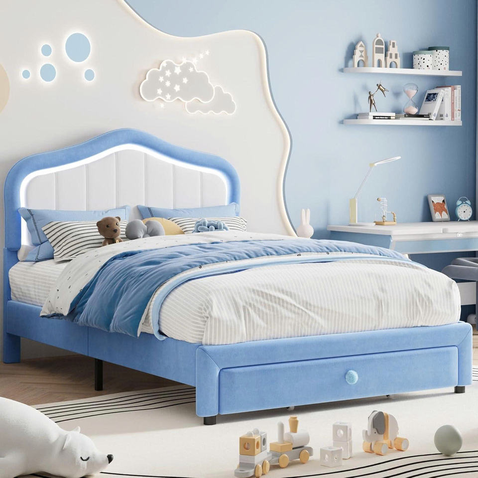 TRIHO-HB-057 Marco de Cama LED de Tamaño Completo con Cajón de Almacenamiento, Cabecera Tapizada en Terciopelo para Niños, Sin Somier, Silencioso
