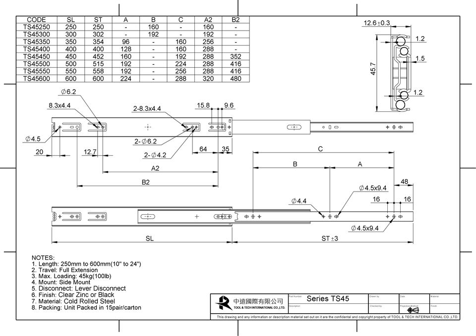 Corredores de cajón chapados en zinc TS45 45kg con rodamiento de bolas para muebles
