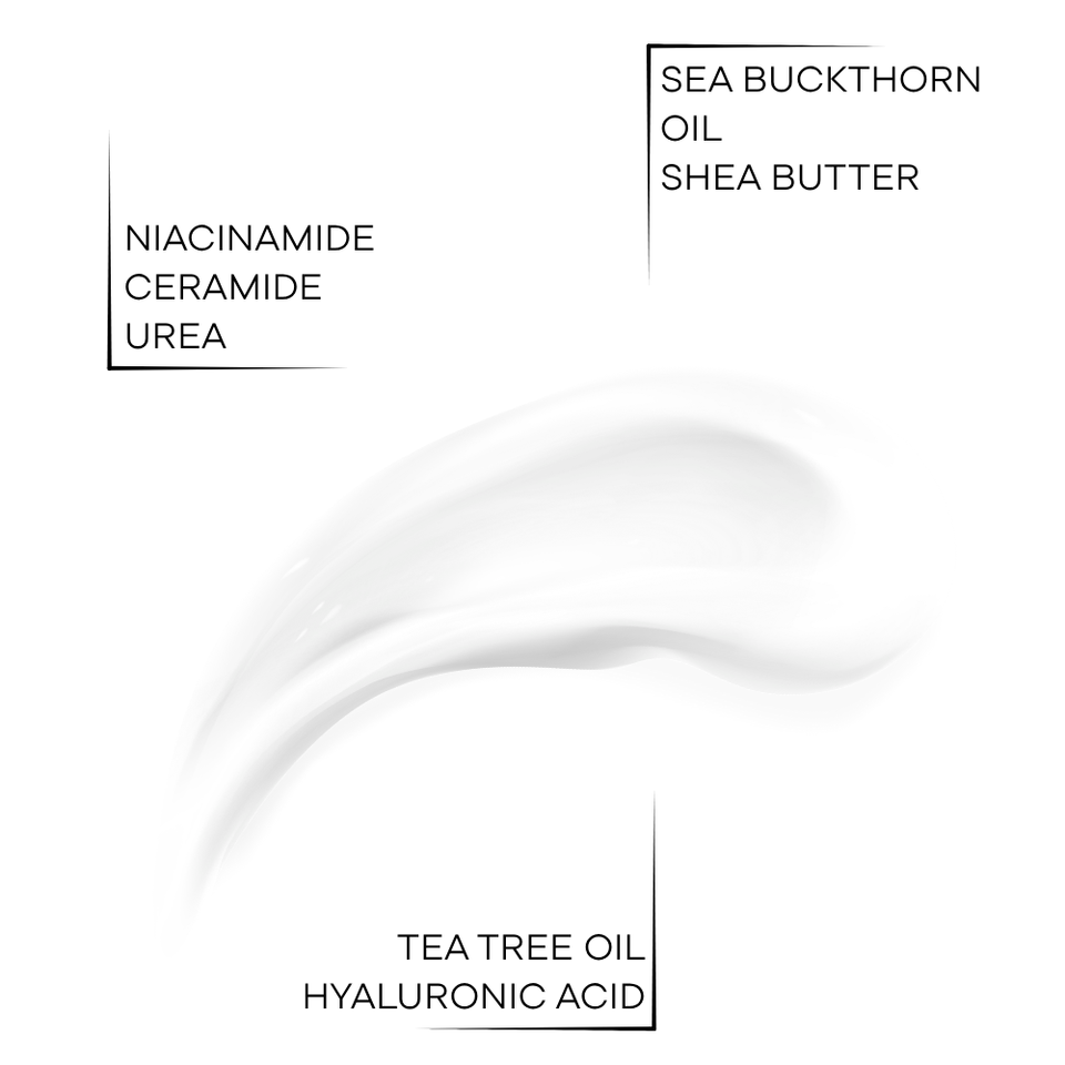 Manteca de karité, Ácido Hialurónico, Urea, Ceramide Complex, Tea Tree OilIngrediente