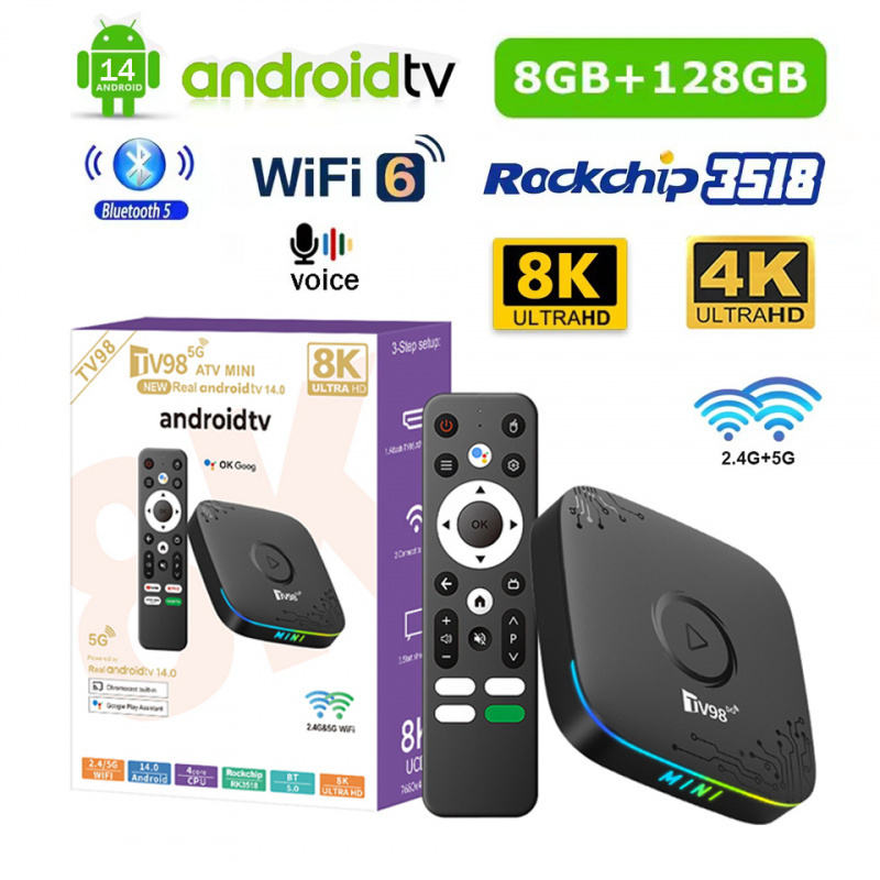 TV98 ATV Mini Android 14 Quad-core TV Box RK3518 4G/5G WiFi de Doble Banda 4K/8K BT5.0 Control Remoto por Voz para 8GB 128GB