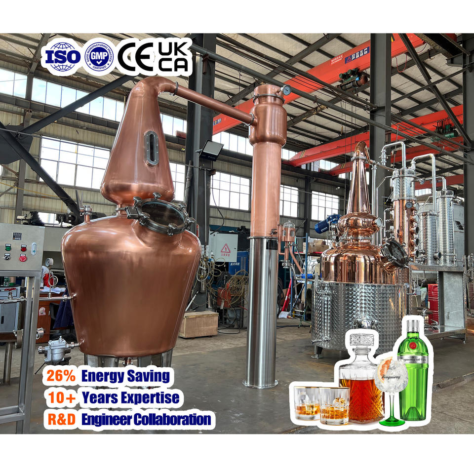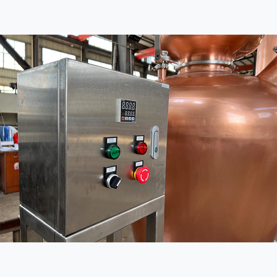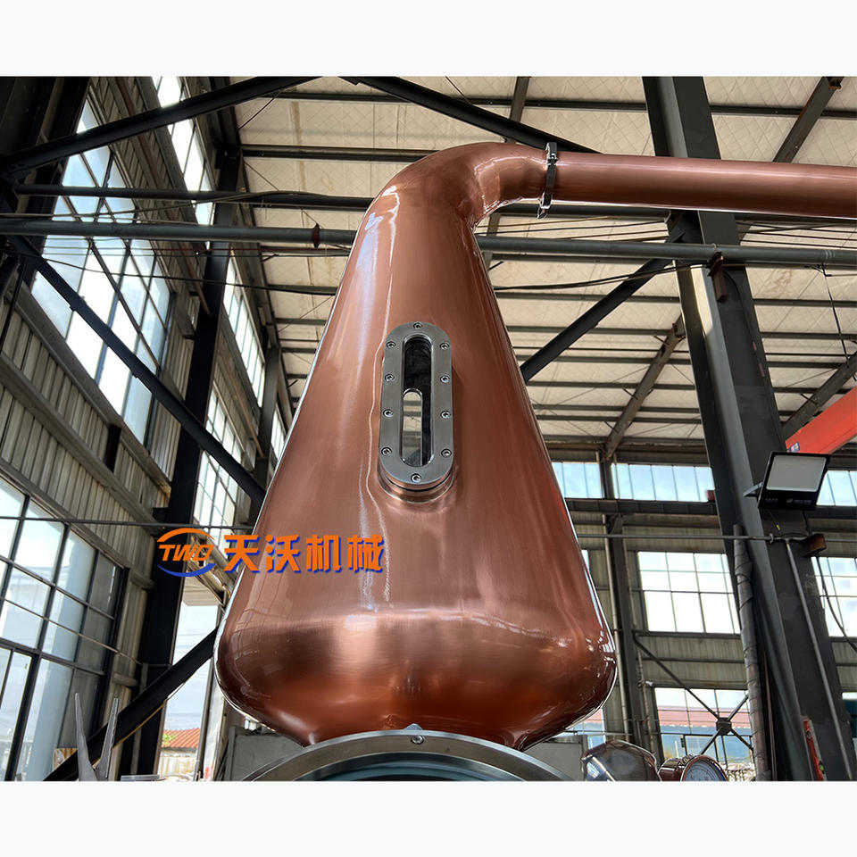 distillation pot, copper head, lyne arm, condensor, parrot outletLos componentes principales.