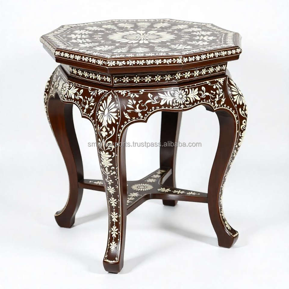 Nombre del producto:Elegante mesa redonda de madera con incrustaciones de hueso